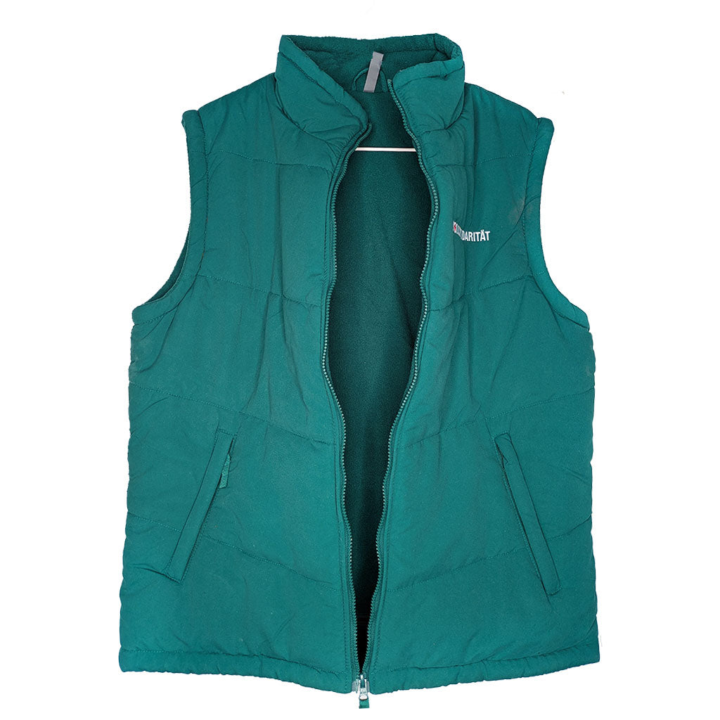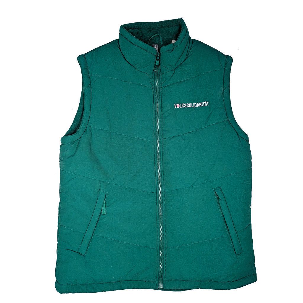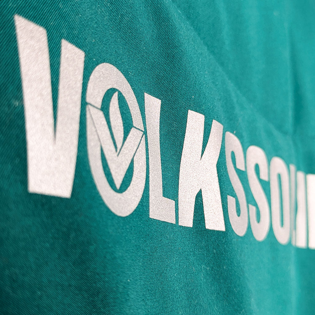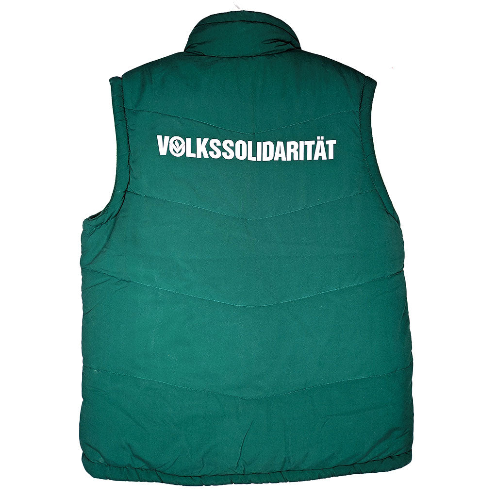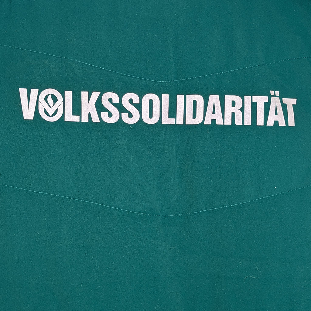 Der Schriftzug der Volkssolidarität ist auf der Brust gestickt und mit einem Reflexdruck auf dem Rücken.