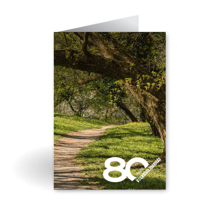 Gefalzte Klappkarte mit Briefumschlag bzw. Postkarte, mit dem Motiv: Baum mit Weg